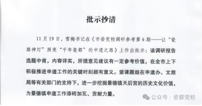 党史党建教研室吴冕老师的研究课题《让“瓷路神灯” 照亮 “ 千年瓷都” 的申遗之路》获得市委主要领导肯定性。